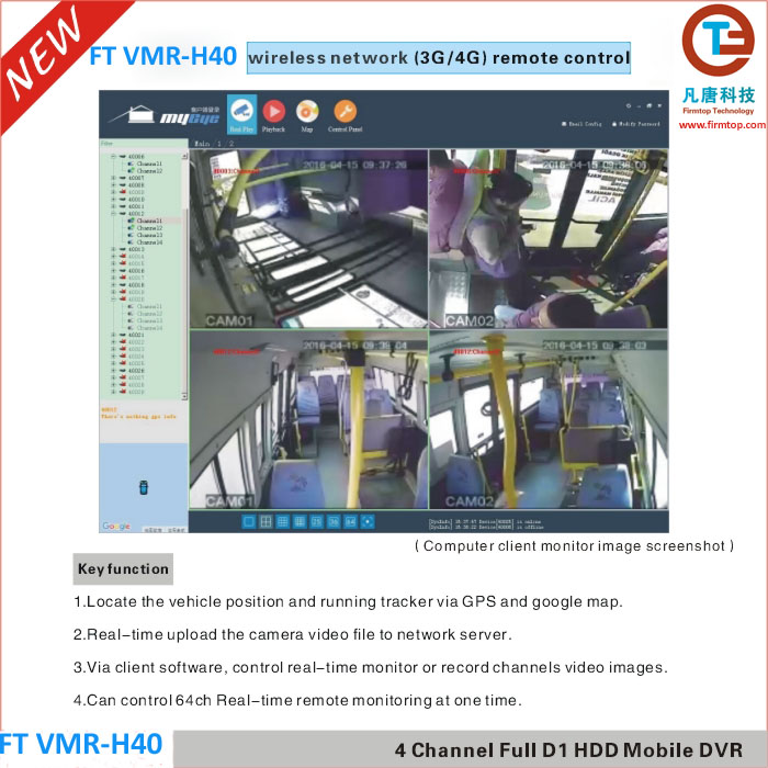 Google地图进行GPS轨迹描点功能;支持局域网网络功能进行影像回放;还支持3G/4G平台进行远程回放
